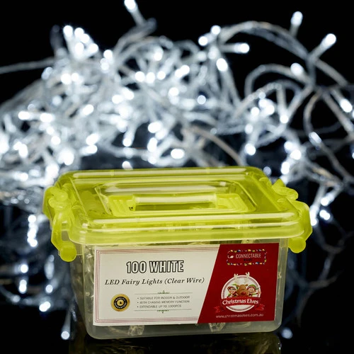 100 LED Connectable Fairy Lights White – Clear Wire Features:Length from first LED to last LED:Â 9.9mLength from adaptor to first LED: 5.2mIncludes:Â power adapterIncludes:Â Re-usable storage tubLED Light Colour: WhiteWire Colour: Clear This fairy light set can be extended using any of the Christmas Elves range of products. Each set can be extended up to 1200 LED lights with power adapter, connected via it’s end to end connectors. These lights can easily GO Solar with this solar panel. Connectable Ready Lights include a large variety of colours (including rose gold, red, white and multicolour). The features include: 8 different styles of twinkling lights Customise the look of your lights from steady on to a beautiful twinkle effect Built in memory featureTurn off your lights at night and when you turn them back on they remember what setting you chose. Connect and extend with more lights on the one adapterNo more trying to get all the lights operating on the same twinkle setting through the tree or over the house. Mix & Match between powered, solar and battery operatedBuy one set of lights and you can swap between a powered adapter, a solar panel or battery pack for remote places. Ability to add extra lead wireNeed to join two light sets with a space in the middle OR start your lights some distance from the power point, just add some extra lead wire.It’s time to get creative and bring magic to your lights.You can add icicle lights to an acrylic mushroom … and then an acrylic Santa Claus … and then to a set of string (fairy) lights. Your creativity has no boundaries.The logo is your guarantee of quality. Connectable Ready Lights This Christmas, imagine your home shining brightly. The Connectable Ready light system works both indoors and out, making it easy to transform your home into a festive celebration. Each home can have a tailor-made Christmas light installation thanks to the wide range of styles, colours, and sizes available. Among the many types of lights available are fairy lights (also called string lights), icicle lights, netting lights, copper wire lights, curtain lights, battery lights and acrylic motifs. Time to decorate your home with light your way! Outdoor Use Connectable Ready lights are suitable for both indoors and outdoors. Use fairy lights to wrap around a pole or tree trunk. Then hang icicle lights on your home’s roof or gable. Then lay a NET light over a bush or on your roof. These are just some ideas to use to share the spirit of Christmas with your family and friends this holiday season. Other options to bring Christmas festivities outdoors and add some holiday cheer to the outside of your home. There are many outdoor lighting options for our connectable lights. Use fairy lights to outline your windows. Decorative icicle lights and fairy lights make a great addition to poolside trees or shrubs and help you set a party mood ideal for backyard barbecues when lined around your deck or patio. Fun Lighting Hang these multicoloured LED fairy lights for a fun addition to parties. Wind the 400 lights around the base of centerpieces to bring a unique touch to table centerpieces, or place them in glass deco blocks to highlight hand-made Christmas vignettes. These lights will shine bright or twinkle softly for a traditional look on your Christmas tree or in your home decor, and it also features a chasing memory function that imparts some pizzazz to staid classic holiday themes. Expandable Design Add these LED fairy lights to small spaces for a splash of color, or use an extra light set for a bigger impact. Measuring 39.9 metres from the first LED bulb to the last, these fairy lights feature an expandable design that lets you cover lots of ground by connecting up to three light sets end to end. You can connect up to 1,200 LED lights to one power adapter. This gives enough light for large Christmas trees and long arches or overhangs. They also look great wound through staircase banisters or lined around windows. Simple Operation Plug these LED fairy lights into standard outlets thanks to their included power adapter. You will love that each set includes a 5 metre lead wire between the first bulb and the power adapter. Start lighting where you need, and if you need more leadwire you can connect multiple together. End-to-end connectors on each set make it simple to string lights together and illuminate them via a single power source for easy operation. Low Energy Consumption For low energy consumption, choose Connectable Ready LED lights. You can create a sustainable indoor or outdoor lighting theme this Christmas and into the new year with LED bulbs that use little power. As well as using a single source of power, you can add other light sets in the Connectable Ready range. Fuss-Free Storage Unpack these LED fairy lights from the sturdy container, then place them back inside when you finish using them to brighten your home. The clear container with locking lid lets you easily see what’s inside before you open it for quick identification of Christmas decorations, and the blue top includes a handle on the top and sides for hassle-free movement. Additionally, the flat top lets you stack like boxes together to make the most of your indoor storage space. Flexible Decorating Utilize single or multiple strands of multi coloured LED fairy lights for a uniform design theme, or pair it with other colour strands, including options with white, warm white, rose gold and red bulbs, for a fun custom look. Christmas Elves carry these fairy lights with both green wires that easily match Christmas trees and natural landscaping features and clear wires that blend in your homes palettes Extended Usage Extend your use of these LED fairy lights further by pairing them with a solar panel for added affordability. Christmas Elves offer extra lead wire to help you personalise the length so you can hang the lights in out-of-the-way spaces like along the edge of your gutters or around your