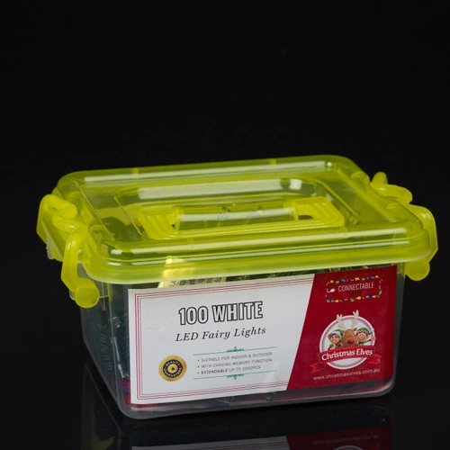 100 LED Connectable Fairy Lights White Features:Length from first LED to last LED:Â 9.9mLength from adaptor to first LED: 5.2mIncludes:Â power adapterIncludes:Â Re-usable storage tubLED Light Colour: WhiteWire Colour: Green This fairy light set can be extended using any of the Christmas Elves range of products. Each set can be extended up to 1200 LED lights with power adapter, connected via it’s end to end connectors. These lights can easily GO Solar with this solar panel. Connectable Ready Lights include a large variety of colours (including rose gold, red, white and multicolour). The features include: 8 different styles of twinkling lights Customise the look of your lights from steady on to a beautiful twinkle effect Built in memory featureTurn off your lights at night and when you turn them back on they remember what setting you chose. Connect and extend with more lights on the one adapterNo more trying to get all the lights operating on the same twinkle setting through the tree or over the house. Mix & Match between powered, solar and battery operatedBuy one set of lights and you can swap between a powered adapter, a solar panel or battery pack for remote places. Ability to add extra lead wireNeed to join two light sets with a space in the middle OR start your lights some distance from the power point, just add some extra lead wire. It’s time to get creative and bring magic to your lights.You can add icicle lights to an acrylic mushroom … and then an acrylic Santa Claus … and then to a set of string (fairy) lights. Your creativity has no boundaries. The logo is your guarantee of quality. Connectable Ready Lights This Christmas, imagine your home shining brightly. The Connectable Ready light system works both indoors and out, making it easy to transform your home into a festive celebration. Each home can have a tailor-made Christmas light installation thanks to the wide range of styles, colours, and sizes available. Among the many types of lights available are fairy lights (also called string lights), icicle lights, netting lights, copper wire lights, curtain lights, battery lights and acrylic motifs. Time to decorate your home with light your way! Outdoor Use Connectable Ready lights are suitable for both indoors and outdoors. Use fairy lights to wrap around a pole or tree trunk. Then hang icicle lights on your home’s roof or gable. Then lay a NET light over a bush or on your roof. These are just some ideas to use to share the spirit of Christmas with your family and friends this holiday season. Other options to bring Christmas festivities outdoors and add some holiday cheer to the outside of your home. There are many outdoor lighting options for our connectable lights. Use fairy lights to outline your windows. Decorative icicle lights and fairy lights make a great addition to poolside trees or shrubs and help you set a party mood ideal for backyard barbecues when lined around your deck or patio. Fun Lighting Hang these multicoloured LED fairy lights for a fun addition to parties. Wind the 400 lights around the base of centerpieces to bring a unique touch to table centerpieces, or place them in glass deco blocks to highlight hand-made Christmas vignettes. These lights will shine bright or twinkle softly for a traditional look on your Christmas tree or in your home decor, and it also features a chasing memory function that imparts some pizzazz to staid classic holiday themes. Expandable Design Add these LED fairy lights to small spaces for a splash of color, or use an extra light set for a bigger impact. Measuring 39.9 metres from the first LED bulb to the last, these fairy lights feature an expandable design that lets you cover lots of ground by connecting up to three light sets end to end. You can connect up to 1,200 LED lights to one power adapter. This gives enough light for large Christmas trees and long arches or overhangs. They also look great wound through staircase banisters or lined around windows. Simple Operation Plug these LED fairy lights into standard outlets thanks to their included power adapter. You will love that each set includes a 5 metre lead wire between the first bulb and the power adapter. Start lighting where you need, and if you need more leadwire you can connect multiple together. End-to-end connectors on each set make it simple to string lights together and illuminate them via a single power source for easy operation. Low Energy Consumption For low energy consumption, choose Connectable Ready LED lights. You can create a sustainable indoor or outdoor lighting theme this Christmas and into the new year with LED bulbs that use little power. As well as using a single source of power, you can add other light sets in the Connectable Ready range. Fuss-Free Storage Unpack these LED fairy lights from the sturdy container, then place them back inside when you finish using them to brighten your home. The clear container with locking lid lets you easily see what’s inside before you open it for quick identification of Christmas decorations, and the blue top includes a handle on the top and sides for hassle-free movement. Additionally, the flat top lets you stack like boxes together to make the most of your indoor storage space. Flexible Decorating Utilize single or multiple strands of multi coloured LED fairy lights for a uniform design theme, or pair it with other colour strands, including options with white, warm white, rose gold and red bulbs, for a fun custom look. Christmas Elves carry these fairy lights with both green wires that easily match Christmas trees and natural landscaping features and clear wires that blend in your homes palettes Extended Usage Extend your use of these LED fairy lights further by pairing them with a solar panel for added affordability. Christmas Elves offer extra lead wire to help you personalise the length so you can hang the lights in out-of-the-way spaces like along the edge of your gutters or around your ceiling’s 