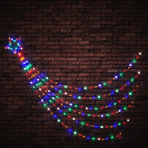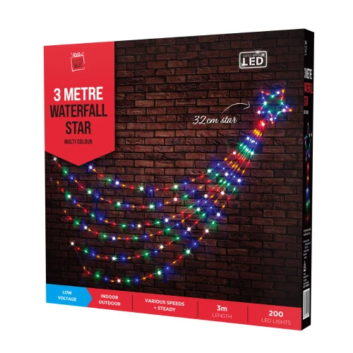 200 LED Waterfall Star Multi Colour Size: 3m Length Incl 30cm Star / 5 Strands / 5m Lead Low voltage Outdoor/ indoor Various speeds and steady 200 LED lights Memory Speed Controller Colour Box: 34 x 34 x 7cm
