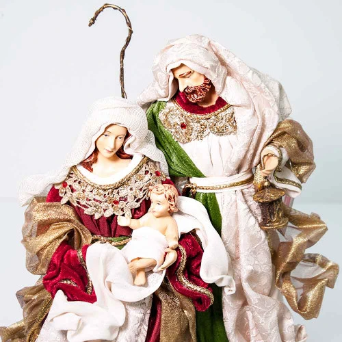 Burgundy Green Standing Holy Family on Base Size: 35cm This stunning nativity scene is a collectors must have. Mary sitting down on chair, embracing baby Jesus wth Joseph by her side. Dressed in rich coloured, textured and shimmery fabrics and embellished with trims