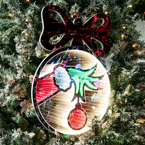 Dr Seuss Grinch Hand in Bauble Infinity Light Size: 56cm These incredible Infinity Lights are made from mirrors on both sides, with LED lights illuminated within, reflecting off of mirrors, and repeating the effect indefinitely. The effect of the light is seen from all sides, albeit it is more noticeable in the shadows. Low voltage and an Australian-standard plug on a three-meter extension cord. The product has a string for hanging. Features Indoor use only Low Voltage for safety Creates lighting atmosphere Comes fully assembled Specifications Size: 60cm x 60cm LED Colours: Green, Red 3m lead wire Cable Colour: Clear Power: 9 W Hang cord attached Voltage: 220-240V Transformer: IP20 SAA Approved Australian Plug