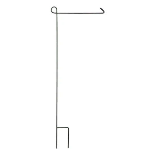 Garden Stand Size: 112cm Two Ways to Install Your Flag Stand: Slide the bottom prongs into an Evergreen Garden Flag Stand Base (available separately) and display on your porch, patio, deck, etc. Insert the bottom prongs directly into your yard or garden. Installation Tips: Installing your stand is easiest in damp soil.f your soil is dry, pour 1 gallon of water across the area and allow the liquid to soak in. Push the bottom prongs into the dirt until they are completely covered. No tools required. Slide the flag’s sleeve onto the top bar. Push it over until the flag’s edge reaches the vertical pillar of the stand. Place the Evergreen Flag Rubber Stopper onto the end of the pole to prevent the flag from blowing off the stand. When bad weather is predicted, flags should be taken down.
