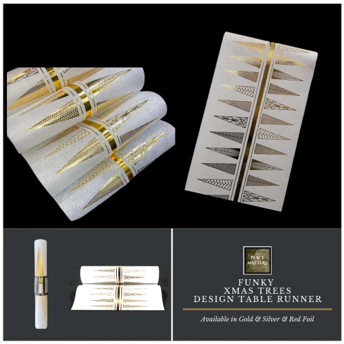 Gold Funky Christmas Tree Table Runner Size:Â Â 30cm These Foil Table Runners are made from Foil Embossed Non-Woven Paper