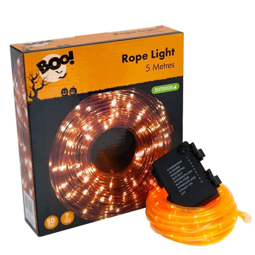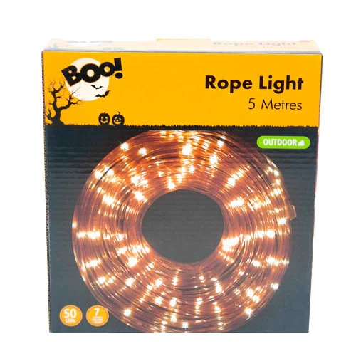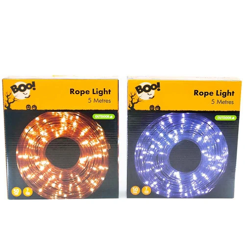 Halloween Rope Light (2 Colours) Size: 5m The Halloween rope light is an excellent option for decorating your Halloween party or the venue where your party will be held with this lighting scheme. Each sold separately. Subject to availability Colours: Orange, Purple