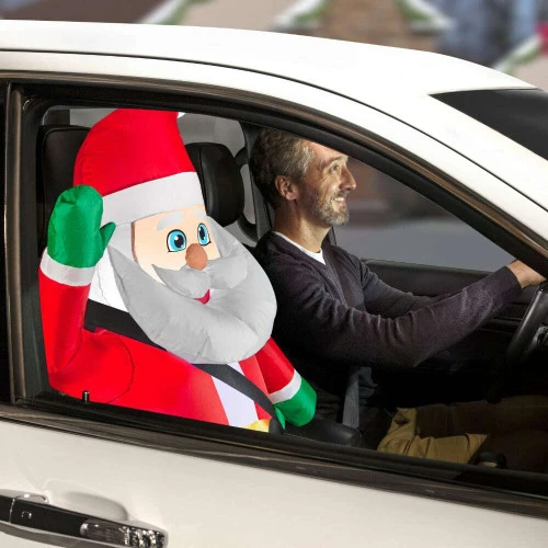 Self Inflating Santa Claus Car Passenger Size: 90cm Be the envy of other motorists, as your passenger is Santa Claus. This adorable inflatable makes an entertaining addition to your car travels. This self inflating Santa is sure to delight anyone who passes by as they notice that Santa Claus is your car buddy. This air powered companion uses the car cigarette lighter for power. Take Santa along for a ride with this inflatable passenger that’s sure to delight. Setup is super simple. Just plug it in, let it inflate and strap it down. Use Car Buddy Santa in any passenger seat. Includes everything needed for easy setup. • Ride-along passenger for your car!• Lights up with bright, energy-efficient LED lighting• Self-inflates in seconds for easy setup• Includes stakes and tethers for outdoor setup• Deflates for easy storage• For indoor or outdoor use Note: This inflatable can not be used as a 2nd passenger on Express Lanes that require 2 people in a vehicle.