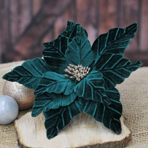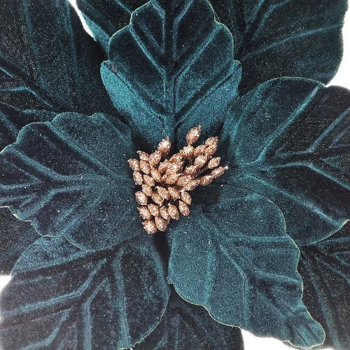 Lush Dark Green Velvet Poinsettia Size: Full Length: 65cm Stem Only: 50cm Diameter:  32cm This lush green velvet Poinsettia is a classic festive flower, perfect for your Christmas decorating. Brilliant placed in your Christmas tree, wreath, centrepiece or vase. Did you know? Poinsettias aren’t always red and the showy, colorful bloom of the poinsettia isn’t a flower – it’s actually a modified leaf. Poinsettia are available in more than 100 different colours and varieties from Red, White, Salmon to Yellow, Cream and Apricot.