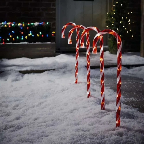 Red White Connectable Candy Cane Lights (Set of 4) Size: 58cm Line your path or driveway this Christmas with these charming red and white striped candy cane lights. The canes are easy to install, all you need to do is simply stake them securely into soft ground and away you go.  Product Features: Set of 4 canes Cane Height: 58cm Total Height: 70cm Spacing between two canes: 50cm 5m Lead Wire 8 Functions Connectable up to 6 Sets (Total 24PCS Candy Canes) Power Source: Low Voltage Plug in For Indoor & Outdoor Use (Transformer for Indoor use only) 6 pcs /Ctn. Â