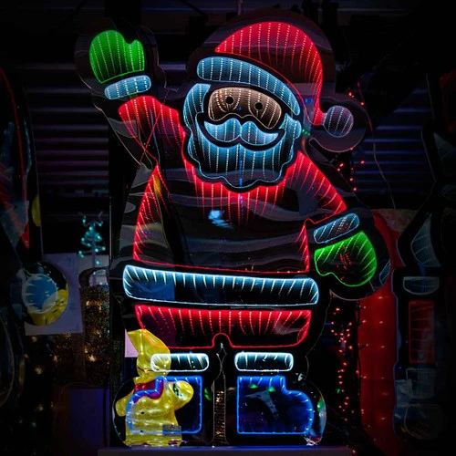 Santa Claus Infinity Light (Indoor) Size: 74cm What better way to spread holiday cheer than with the man himself? The solid oak foundation supports the dazzling, colourful LED lights that make Santa’s waving deliver magic and holiday cheer to the whole family and the neighbourhood. The infinite loop it produces is sure to spark conversation. What better way to spread holiday cheer than with the man himself?Â