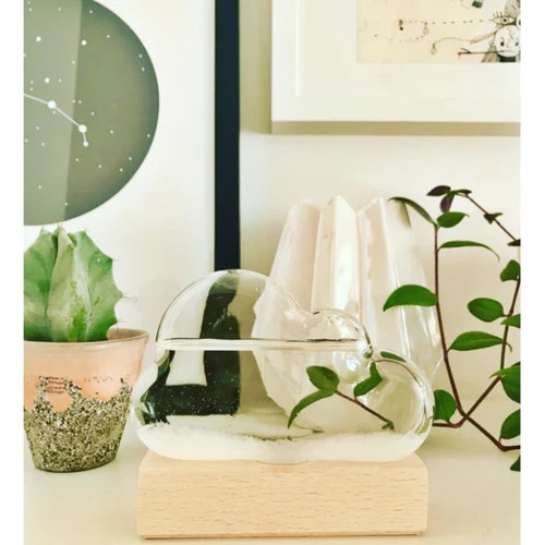 Storm Cloud Weather Predictor Size: 12.5cmx2.9cmx10.5cm See how the cloud changes shape as a means of weather forecasting. Cloud crystals have diverse responses depending on the weather. It may take the cloud a few days to adjust to its new environment, but once it does, the liquid within will produce little clouds in the glass to reveal the coming weather. High quality glass Clear liquid: Bright and clear Cloudy liquid: Cloudy, possible thunderstorms & rain Small dots in the liquid: Humid or foggy Large flaky crystals: Cloudy skies, snow in winter Threads of crystals at the top: Windy Crystals at the bottom: Frost may be coming