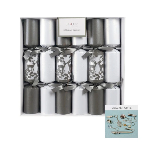 White Silver Deer Platinum Cracker (Pack of 6) Size: 36cm Nothing is more festive than a silver and white Christmas cracker. A beautiful deer design through the centre on a contrast background. Each cracker contains gift, hat, snap and joke. Pack contains 6x crackers